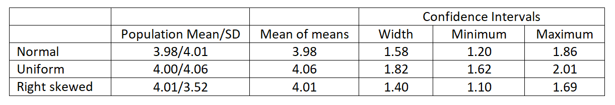 The table below provides the mean of the 100 sample means, the mean width of the 100 confidence intervals, and the minimum and maximum widths. Note, my focus is on the width of the confidence intervals, not the actual values of the lower and upper confidence bounds.