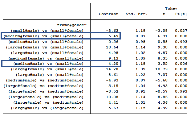 pwcompare frame#gender, mcomp(tukey) pveffects cformat (%6.2fc)