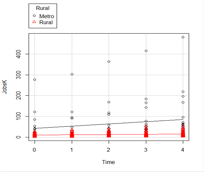 If we’d like to see if the growth in jobs over time is different in Rural and Metropolitan counties, we need a separate line for each group.